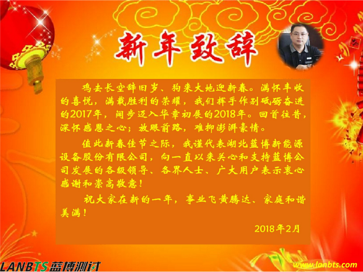 雞去長空辭舊歲、狗來大地迎新春。滿懷豐收的喜悅,滿載勝利的榮耀,我們揮手作別砥礪奮進(jìn)的2017年,闊步邁入華章初展的2018年?;厥淄?,深懷感恩之心;放眼前路,難抑澎湃豪情。值此辭舊迎新之際,我謹(jǐn)代表湖北藍(lán)博新能源設(shè)備股份有限公司,向一直以來關(guān)心和支持藍(lán)博公司發(fā)展的各級領(lǐng)導(dǎo)、各界人士、廣大用戶表示衷心感謝和崇高敬意!祝大家在新的一年,事業(yè)飛黃騰達(dá)、家庭和諧美滿!